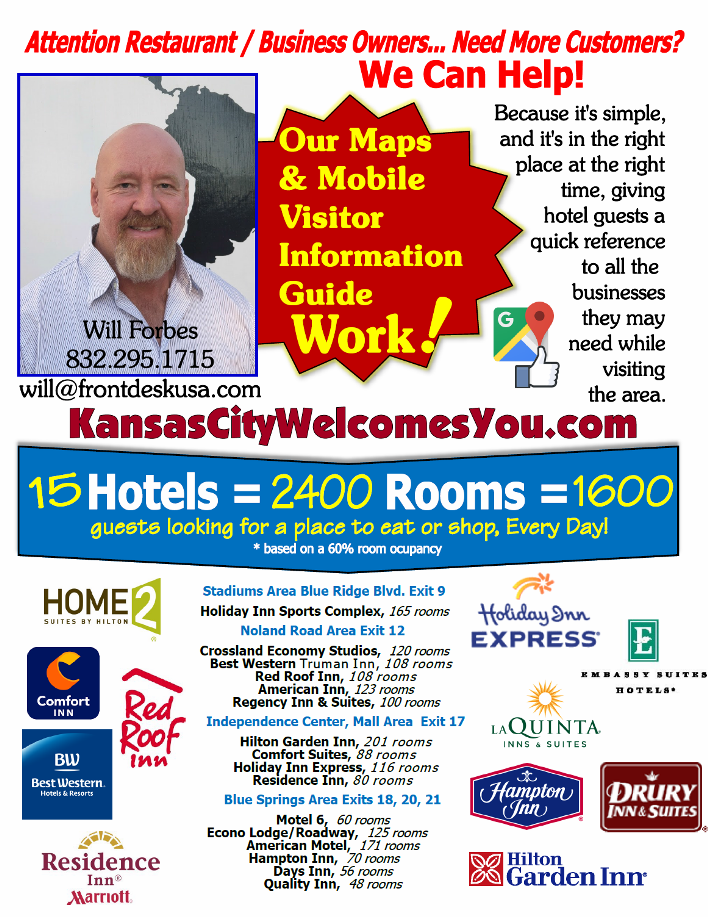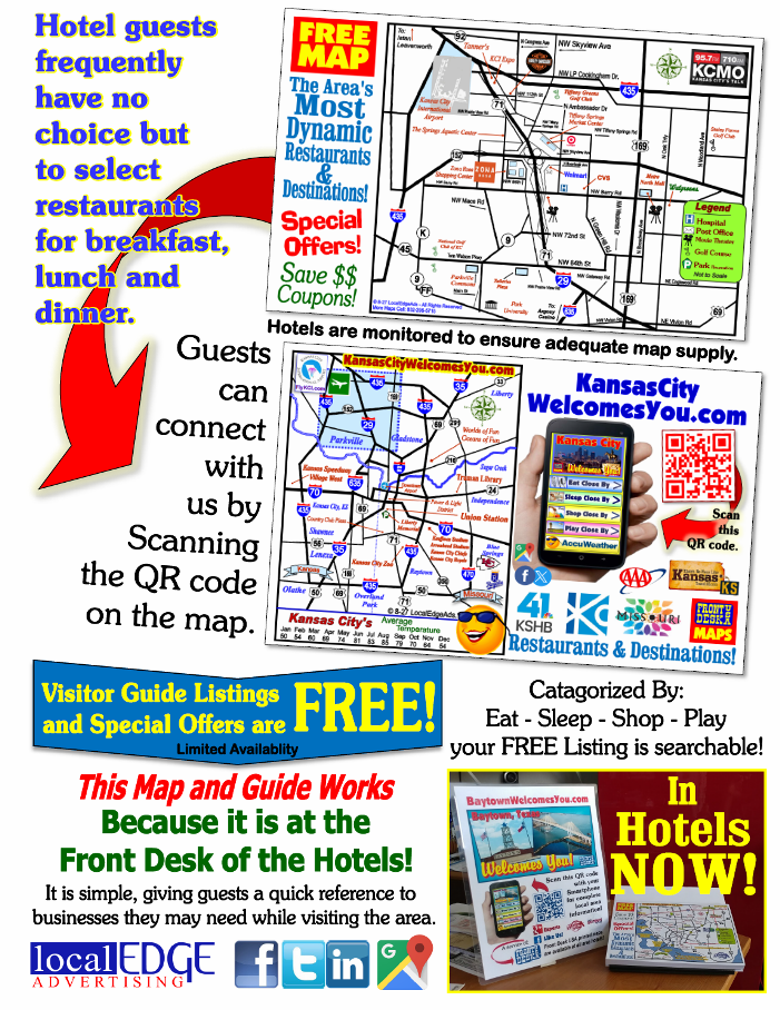 Front Desk USA maps and mobile guide WORK! Because it’s simple, and it’s in the right place at the right time, giving vacationers a quick reference to all the businesses they may need while visiting the area. Many Hotel Guests frequently have no choice but to select restaurants for breakfast, lunch and dinner.